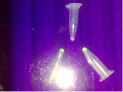 BL-21 細(xì)胞后,在平皿中用IPTG誘導(dǎo)長出菌苔,但未出現(xiàn)單菌落,可能的原因有:(1)菌液沒有涂開;(2)涂完后未先正放1h使菌液充分被LB吸收;(3)平皿上有水珠,未除去;(4)搖菌時間過長,菌過多。**后經(jīng)過IPTG誘導(dǎo)表達(dá),本組中未有一管表達(dá)成功,僅有老師的兩管表達(dá)出綠色的熒光蛋白,表達(dá)量很低,可能的原因:(1)在轉(zhuǎn)化過程中,由于操作不當(dāng),使重組質(zhì)粒本身轉(zhuǎn)化進(jìn)入