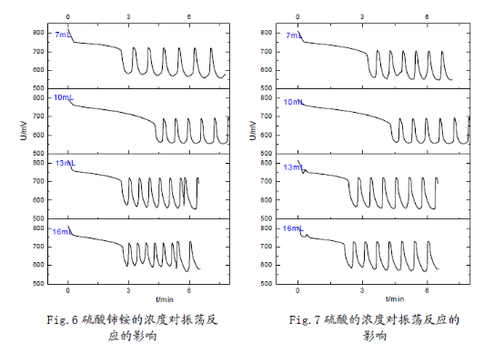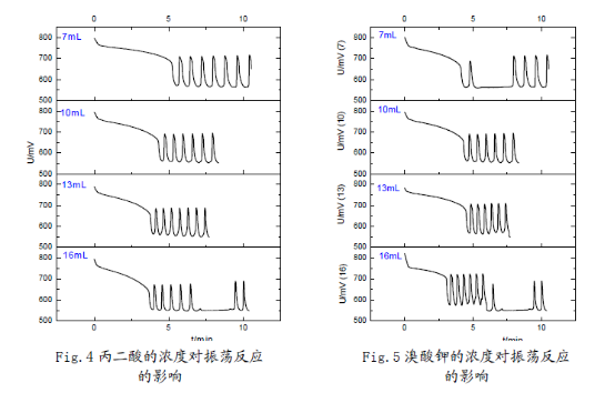 (3) 觀察分析圖形可知:反應(yīng)物的濃度不但影響了誘導(dǎo)時(shí)間和振蕩周期,同時(shí)還影響了振蕩的波形。濃度對(duì)振蕩體系的影響是比較顯著的;但濃度對(duì)振幅的影響卻不大,說(shuō)明濃度對(duì)振蕩體系的各個(gè)參數(shù)的影響是有選擇性的。這也反映出化學(xué)振蕩體系本身的復(fù)雜性,及其極容易受反應(yīng)環(huán)境的影響。