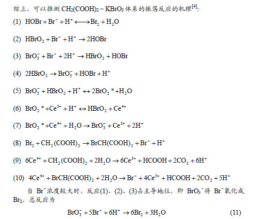 在上述10個(gè)反應(yīng)中,HBrO2具有自催化的特點(diǎn),起著切換振蕩過(guò)程的開(kāi)關(guān)作用。