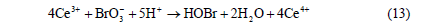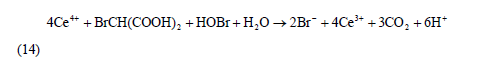 當(dāng)Br-濃度較小時(shí),占主導(dǎo)地位的反應(yīng)為Ce3+被BrO3-氧化成Ce4+,即由反應(yīng)(4)、(5)、(6)合成的第二個(gè)宏觀反應(yīng)(簡(jiǎn)稱過(guò)程B):