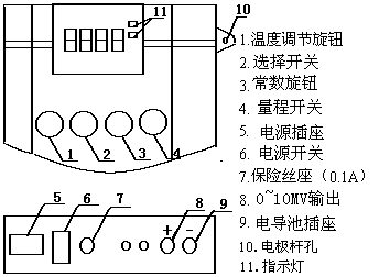 例如,電極常數(shù)為0.85,調(diào)“常數(shù)”鈕使顯示850。常數(shù)為1.1,則調(diào)“常數(shù)”鈕使顯示1100(不必管小數(shù)點(diǎn)位置)。